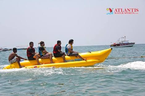 A banana boat (or water sled), is an unpowered, inflatable recreational boat meant to be towed.[1] Different models usually accommodate three to ten riders sitting on a larger, main tube and resting their feet on two laterally flanking tubes which stabilize the boat. The main tube is often yellow and banana-shaped. Some models have two main tubes.