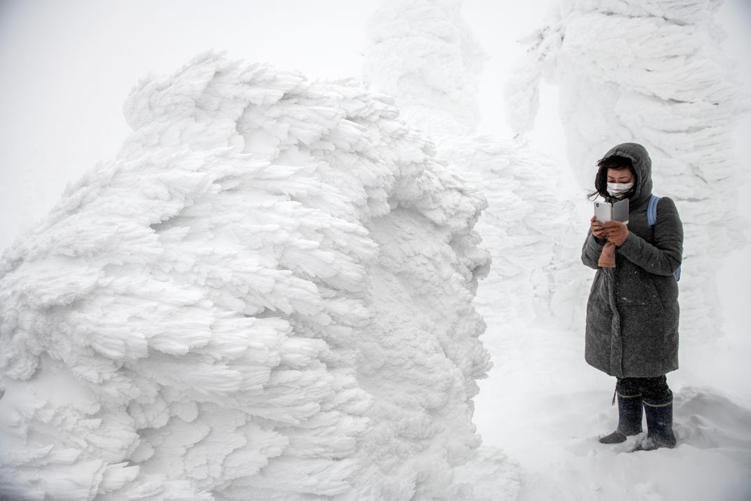 A more obscure and much colder version of this pastime takes place every winter in Japan’s northern Tohoku region. Intense, relentless Siberian winds blow clouds and fog over the region’s native Maries’ fir trees, enveloping them in a thick, granular coating of ice called rime. The result: Once-verdant forests are transformed into throngs of “snow monsters,” or “juhyo,” as they’re called in Japan.