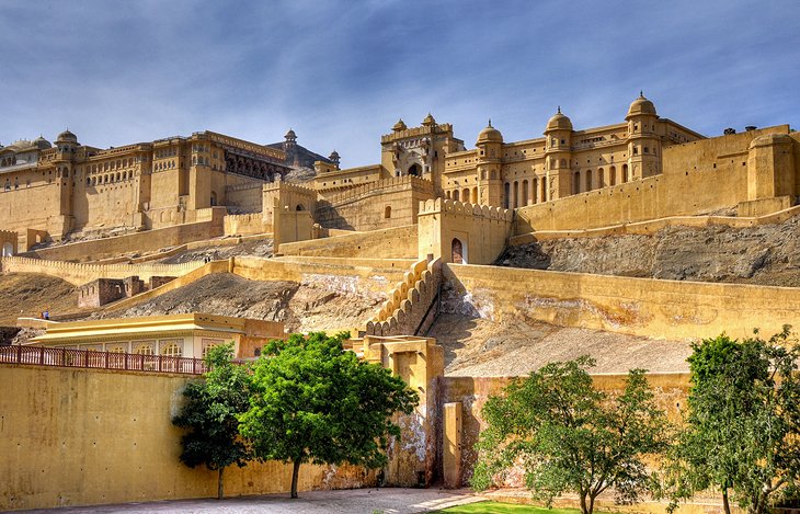 Amer Fort (often also spelt “Amber”) was built as a fortified palace in 1592 by Maharaja Man Singh I and has long served as the capital of Jaipur. Carved high up into the hillside, the fort is accessible on foot via a steep climb or by shuttle rides from the town below (better still, let an elephant do the work). Highlights include Jaleb Chowk, the first courtyard, with its many decorated elephants, and the Shila Devi Temple, dedicated to the goddess of war. Also of note is the adjoining Hall of Public Audience (Diwan-i-Am) with its finely decorated walls and terraces frequented by monkeys. Other highlights include Sukh Niwas (the Hall of Pleasure) with its many flowerbeds and a channel once used to carry cooling water, and the Temple of Victory (Jai Mandir), notable for its many decorative panels, colorful ceilings, and excellent views over the palace and the lake below. Just above Amer Fort is Jaigarh Fort, built in 1726 by Jai Singh and featuring tall lookout towers, formidable walls, and the world’s largest wheeled cannon. Be sure to also spend time wandering the walled Old City of Jaipur with its three fully restored gates and splendid bazaars, as well as the delightful City Palace, a massive complex of courtyards, gardens, and buildings.