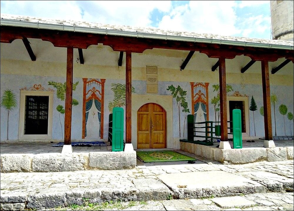 The sleepy town of Stolac can be found on the road from Mostar to Montenegro and Dubrovnik on the banks of the Begrava River in Bosnia (BiH). Right in the centre of town is Čaršija Mosque with it’s captivating full frontage mural. The mosque, along with most of Stolac’s historical buildings, was destroyed in the fighting of 1993. It has been painstakingly and beautifully rebuilt from original material.